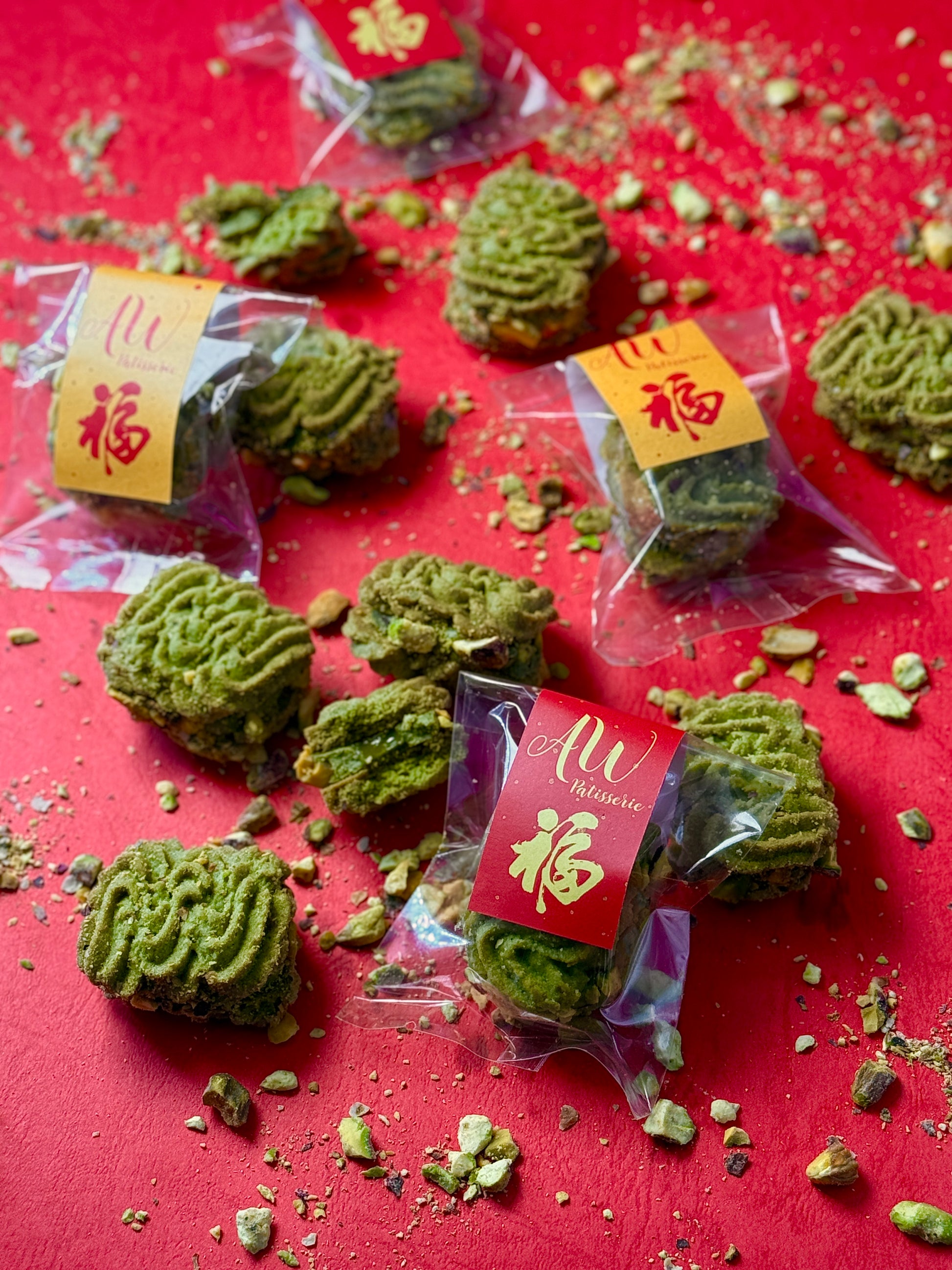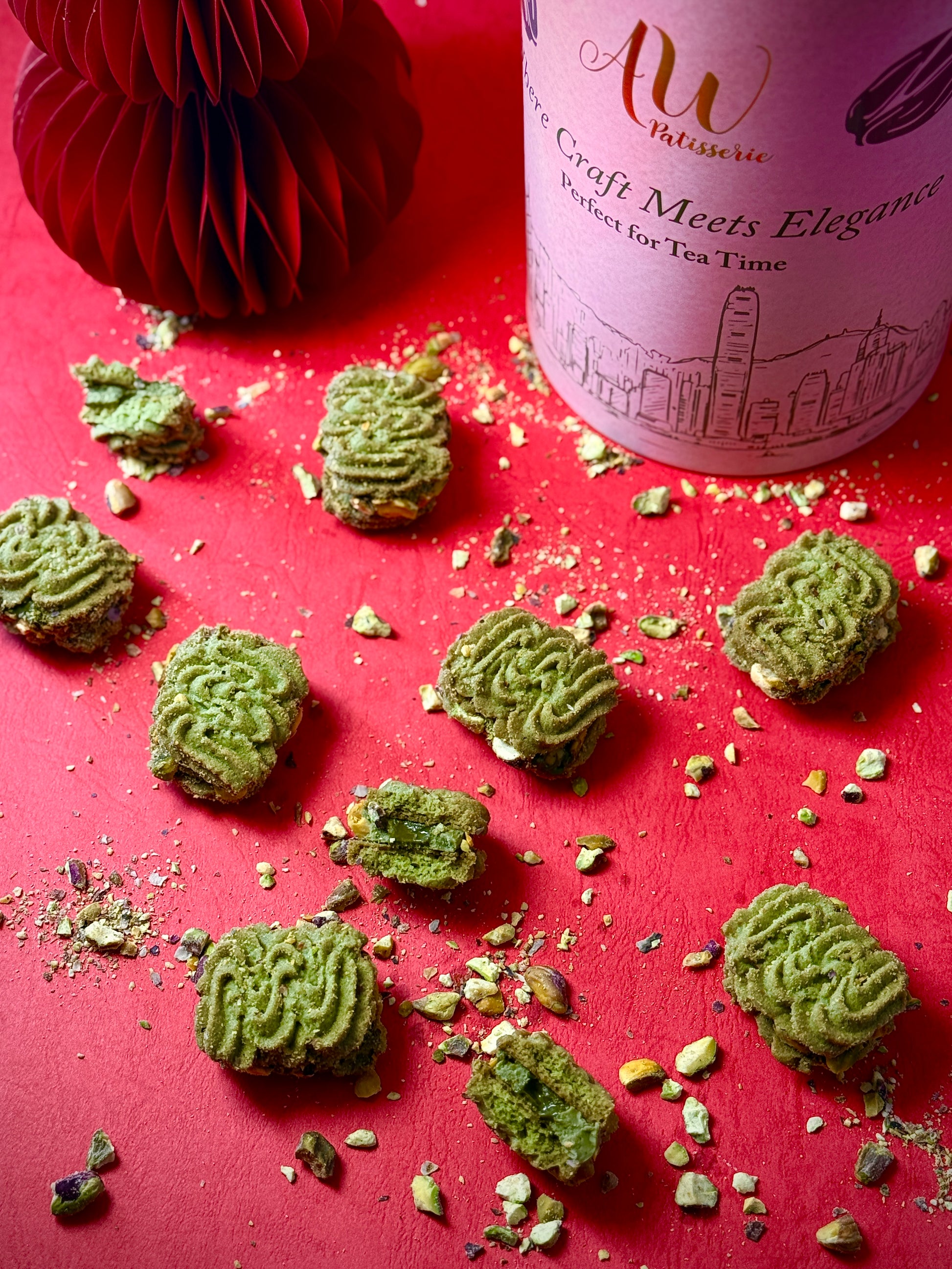 嚴選意大利開心果和法國知名優質牛油President 製作的開心果牛油曲奇,獨特鬆脆配方,每件人手唧出優美波浪形狀,盡顯工藝。