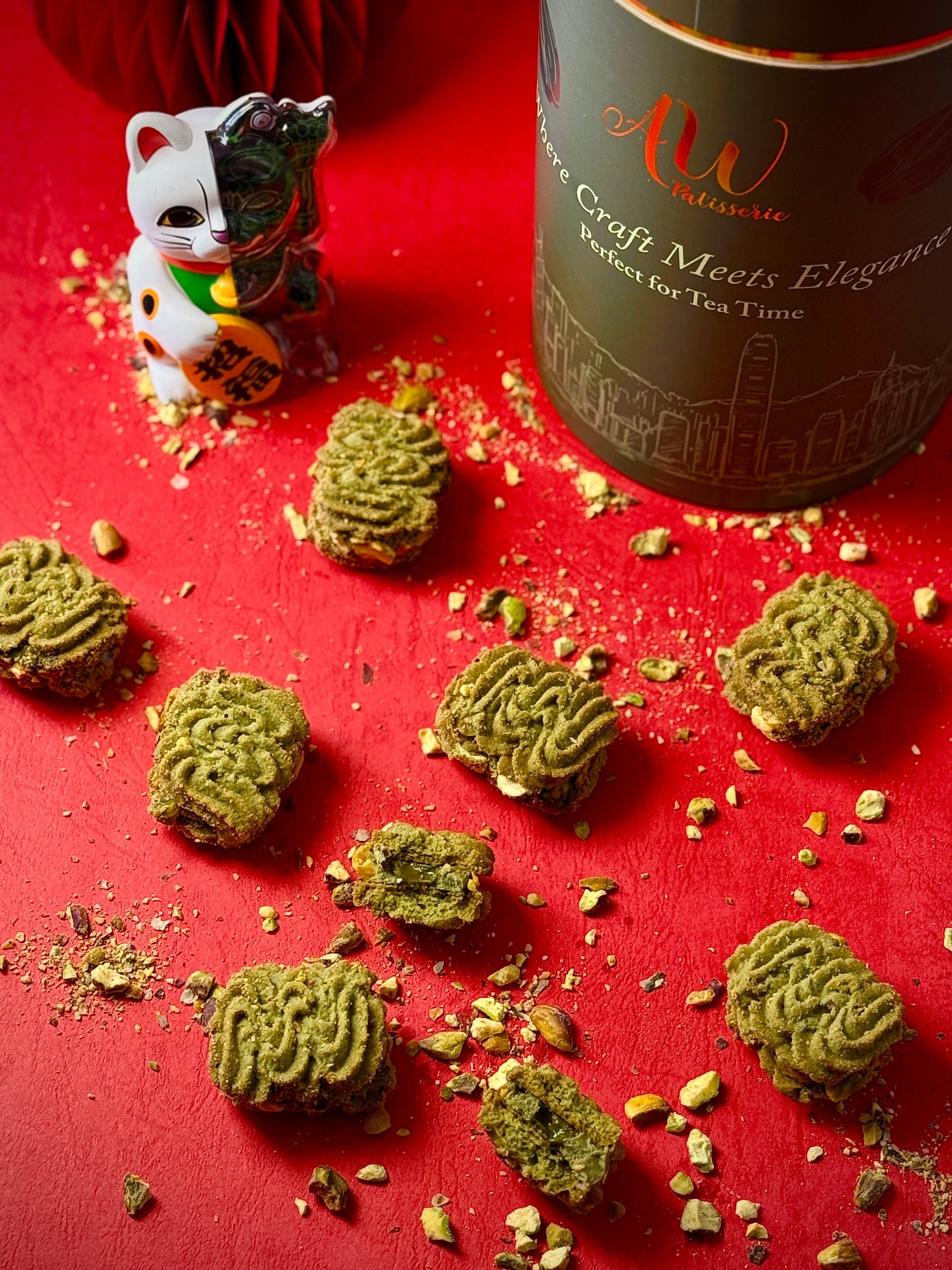嚴選意大利開心果和法國知名優質牛油President 製作的開心果牛油曲奇,獨特鬆脆配方,每件人手唧出優美波浪形狀,盡顯工藝。